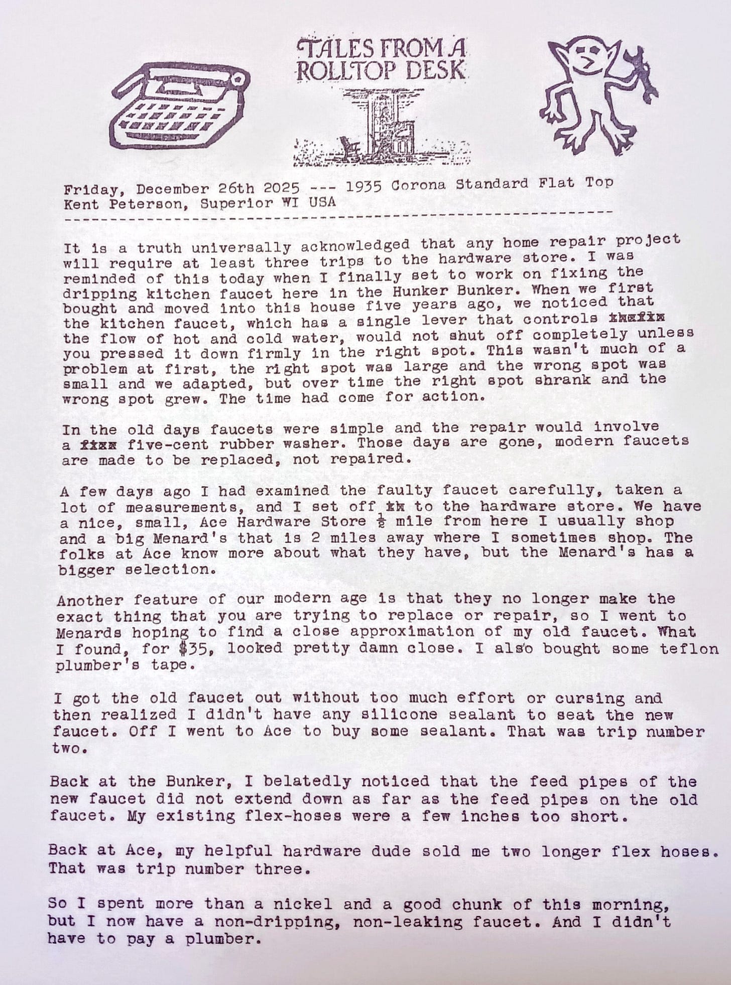 Year and years ago my brother and I had to go to my parent's cabin because they had just been there and noticed a small leak outside. We turned the water on, found the leak and went to a local hardware store to get the copper line we needed. We walked in and being a teenager I noticed a pretty young lady behind the counter. She took my brother to the copper fittings and also sold us a length of copper. She asked if I knew how to solder and I told her "Why no I can't". She said "It's easy" so she gave me a quick lesson. I paid for the parts and free instruction and headed back to the cabin. My brother looked at me when we got in the truck and said, "You know how to solder a copper line." I told him I did but a refresher course was always nice to receive especially from a pretty young lady. He just shook his head.
