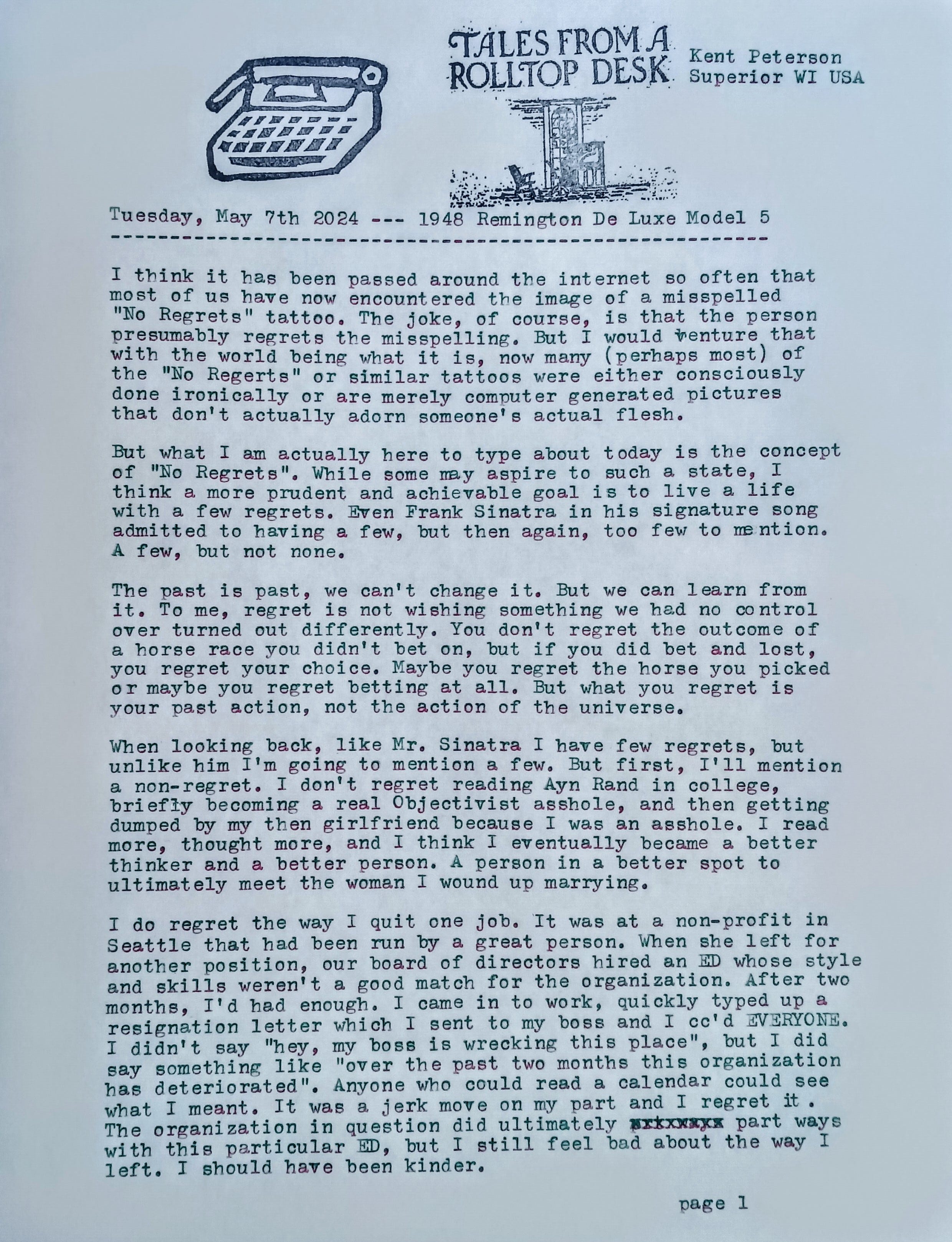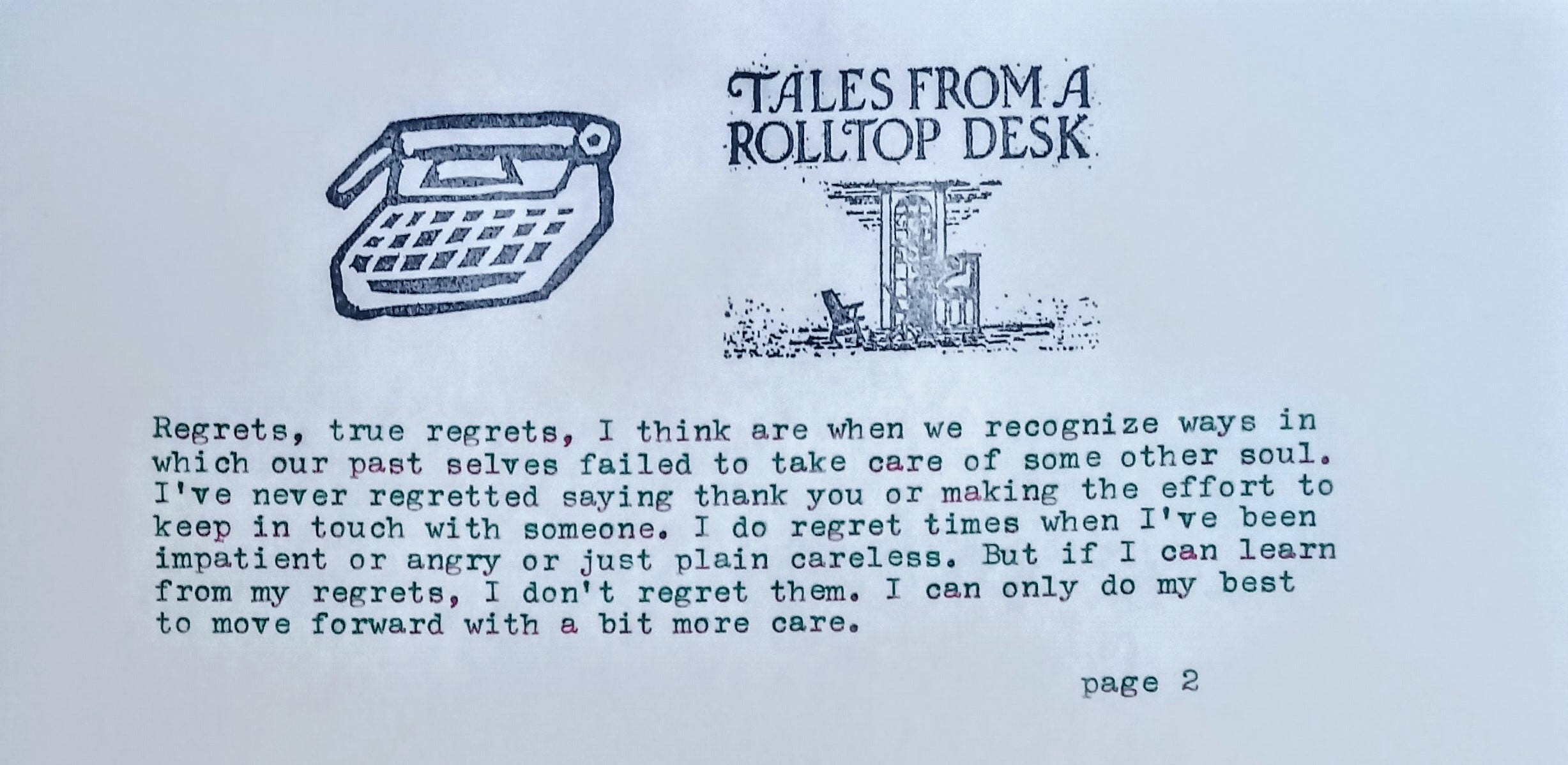 I think a lot of regrets come from the road not taken. The life not lived. That can be difficult, particularly as we mature and the concerns and worries that plagued is when younger begin to seem absurd.